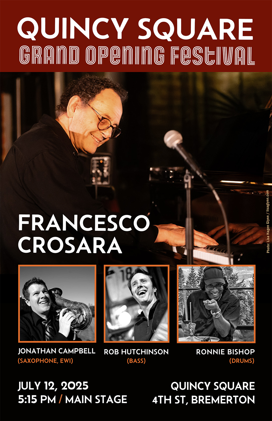 - Francesco Crosara Quartet at Quincy Square Grand Opening FestivalQUINCY SQUARE GRAND OPENING FESTIVAL, BREMERTON: July 12th, 2025 FRANCESCO CROSARA QUARTET: Francesco Crosara, keyboards, Jonathan Campbell, saxophone & EWI, … Continue reading Francesco Crosara Quartet at Quincy Square Grand Opening Festival