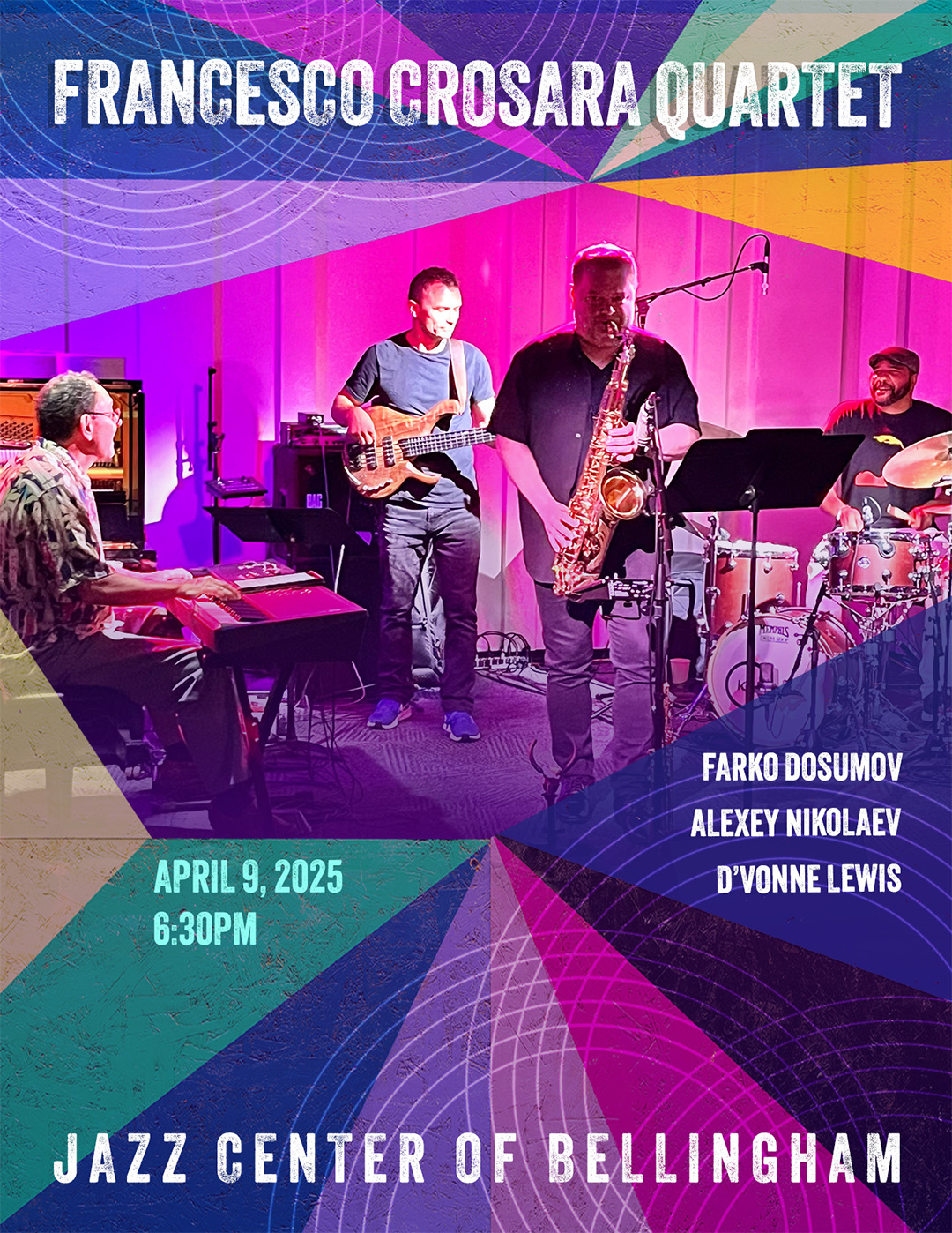 - Francesco Crosara Quartet at Jazz Center of BellinghamTHE JAZZ CENTER OF BELLINGHAM: April 9th, 2025 FRANCESCO CROSARA QUARTET: Francesco Crosara, piano, Alexey Nikolaev, saxophones, Farko Dosumov, bass, … Continue reading Francesco Crosara Quartet at Jazz Center of Bellingham