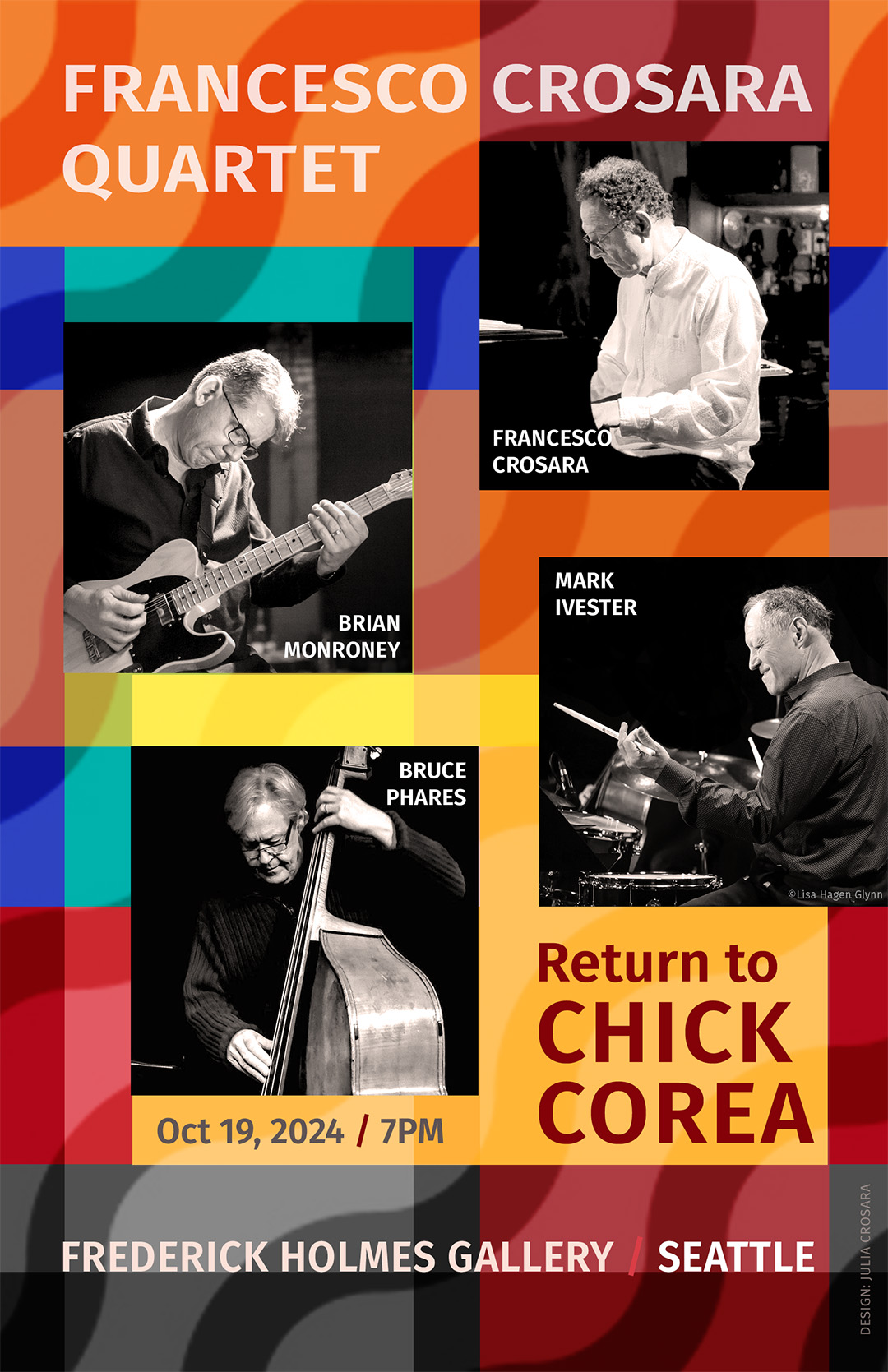 - Return to Chick Corea Band at Frederick Holmes Art GalleryFREDERICK HOLMES ART GALLERY PRESENTS: HOT JAZZ AT THE GALLERY, October 19th, 2024 FRANCESCO CROSARA QUARTET: RETURN TO CHICK COREA: … Continue reading Return to Chick Corea Band at Frederick Holmes Art Gallery
